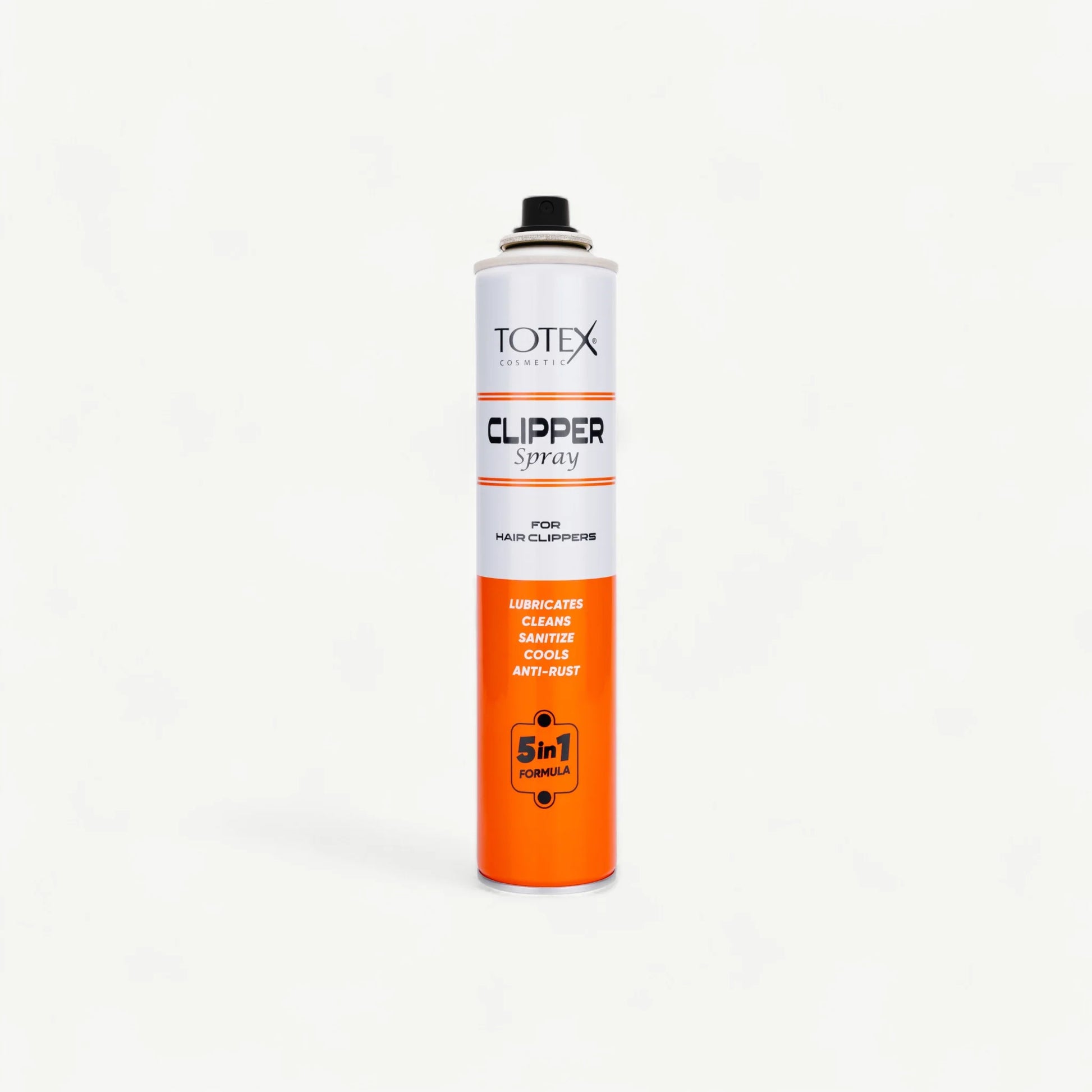 The Totex 5-in-1 Clipper Spray cleans, cools, lubricates, disinfects, and protects blades, ensuring efficient performance.
